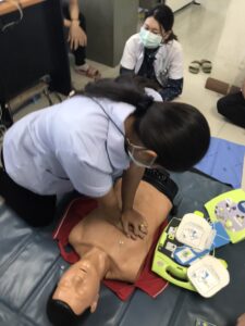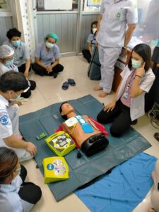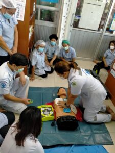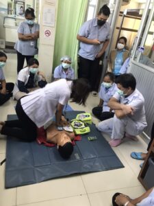 วันที่ 2 กรกฎาคม 2564 เวลา 14.00 น. พว.ปราณีต วงษ์วาท และ นายปยุตพงศ์ พุมไพศาลชัย เจ้าพนักงานเวชกิจฉุกเฉิน ปฏิบัติงานกิจกรรมฝึกซ้อมการใช้เครื่องกระตุกหัวใจไฟฟ้าอัตโนมัติ (AED) และการกู้ชีพเบื้องต้น(CPR) ให้แก่บุคลากร ในหน่วยงานแพทย์แผนไทย จำนวน 15 คน ณ ห้องแพทย์แผนไทย รพ. บรรพตพิสัย เพื่อเตรียมพร้อมรับสถานการณ์ฉุกเฉิน ให้มีทักษะการกู้ชีพเบื้องต้น โดยการฝึกซ้อมในครั้งนี้ได้รับความร่วมมือจากบุคลากร ในหน่วยงานแพทย์แผนไทยเป็นอย่างดี